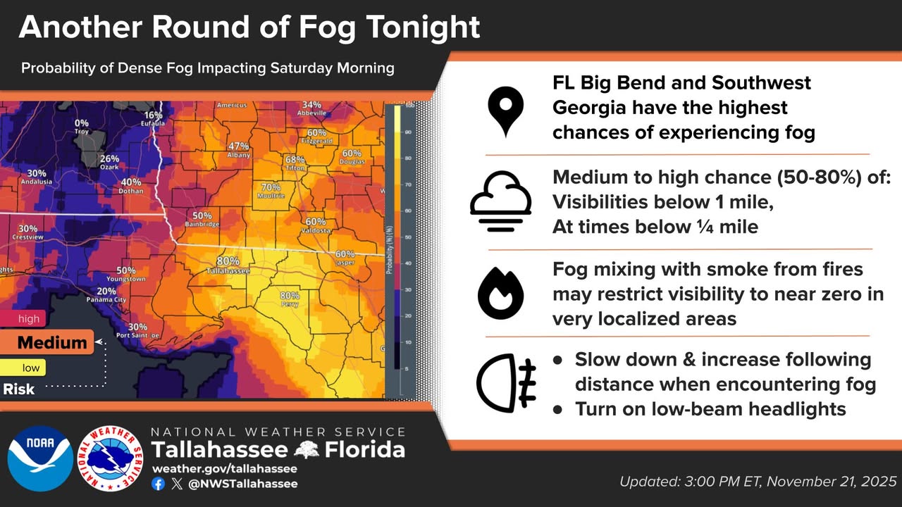 Another round of fog, some dense, is likely again tonight, especially across the Florida Big Bend and portions of south-central Georgia.