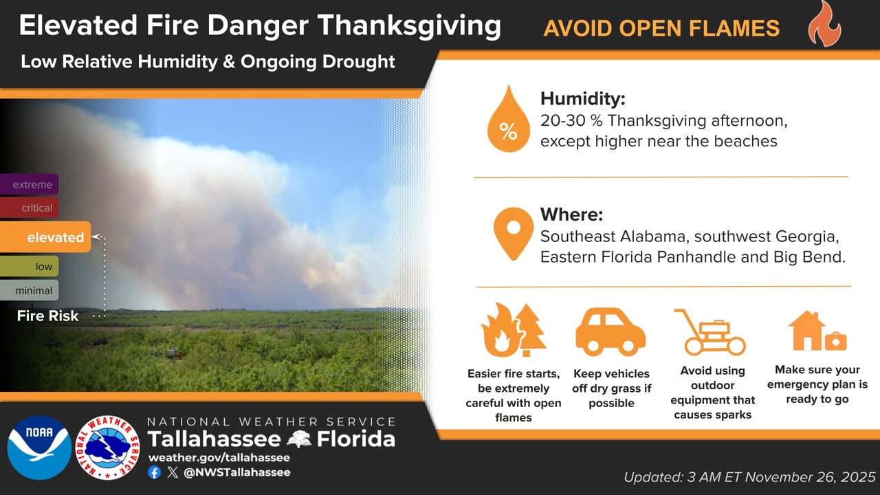 🔥 Elevated fire danger on Thanksgiving due to low RH & ongoing drought.